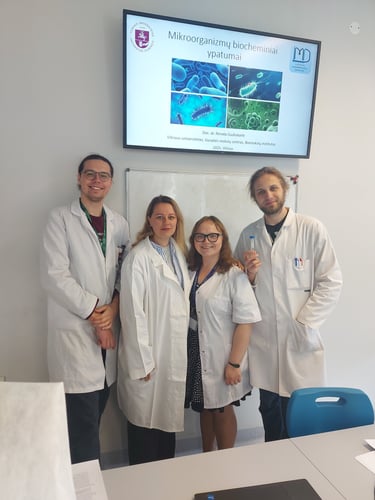 Praktinius mokymus „Mikroorganizmų biocheminiai ypatumai“ vedė dr. Renata Gudiukaitė, dr. Alisa Gricajeva, dr. Vilius Malūnavičius ir Jokūbas Daunoras. Jų metu, naudojant spektrofotometrus, buvo vertinamas fermentų aktyvumas.