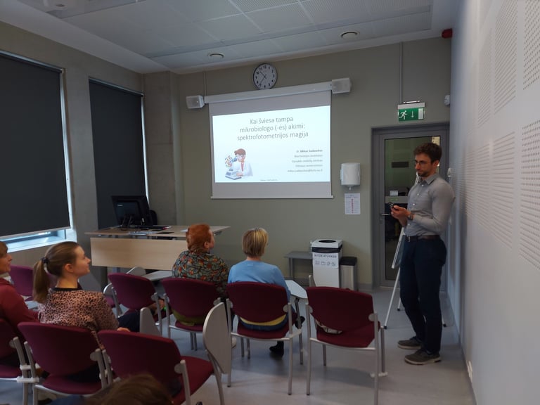 Dr. Mikas Sadauskas skaitė paskaitą „Kai šviesa tampa mikrobiologo akimi: spektrofotometrijos magija“. Jos metu pasakojo apie mikroorganizmų sintetinamus pigmentus ir šviesos taikymą mikrobiologijoje.